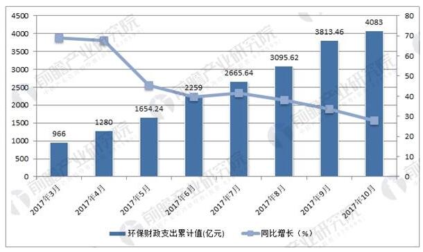 從“九五”時期開始,我國政府高度重視環境保護工作,環境保護投資呈現快速增長趨勢。整個“九五”期間環境保護投資3600億元,是“八五”期間環境保護投資的0.93%。據前瞻產業研究院發布的《2017-2022年中國環保行業發展前景與投資預測分析報告》數據顯示,截止2017年10月底,累計環保財政支出突破4000億,同比增長28.0%。